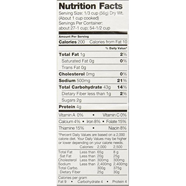 المكونات أرز طويل الحبة مسلوق مسلوق (الحديد [الفوسفات الحديديك] ، النياسين ، أحادي نيترات الثيامين ، حمض الفوليك) ، الخضار المجففة (البصل ، الفلفل الحلو ، الثوم ، الطماطم) ، الملح ، كلوريد البوتاسيوم ، مالتوديكسترين ، سكر ، سكر العنب ، دهن الدجاج ، لحم الدجاج مسحوق ، بحيرات صفراء # 5 ، خميرة ذاتي التحلل ، غوانيلات ثنائي الصوديوم و إينوزينات ، كركم مطحون ، يحتوي على أقل من 2٪ ثاني أكسيد السيليكون (مضاد للتكتل) وزعفران.